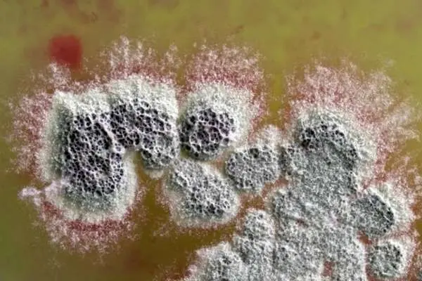 کلنی باکتری Streptomyces coelicolor ترکیب آنتیبیوتیکی (قرمز) را در محیط اطراف خود آزاد میکند.