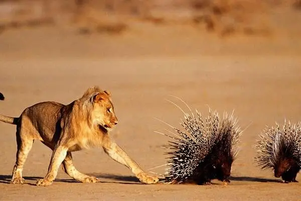 تقابل شیر جوان با جوجهتیغی در دل طبیعت وحشی