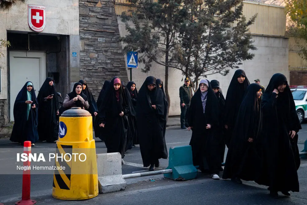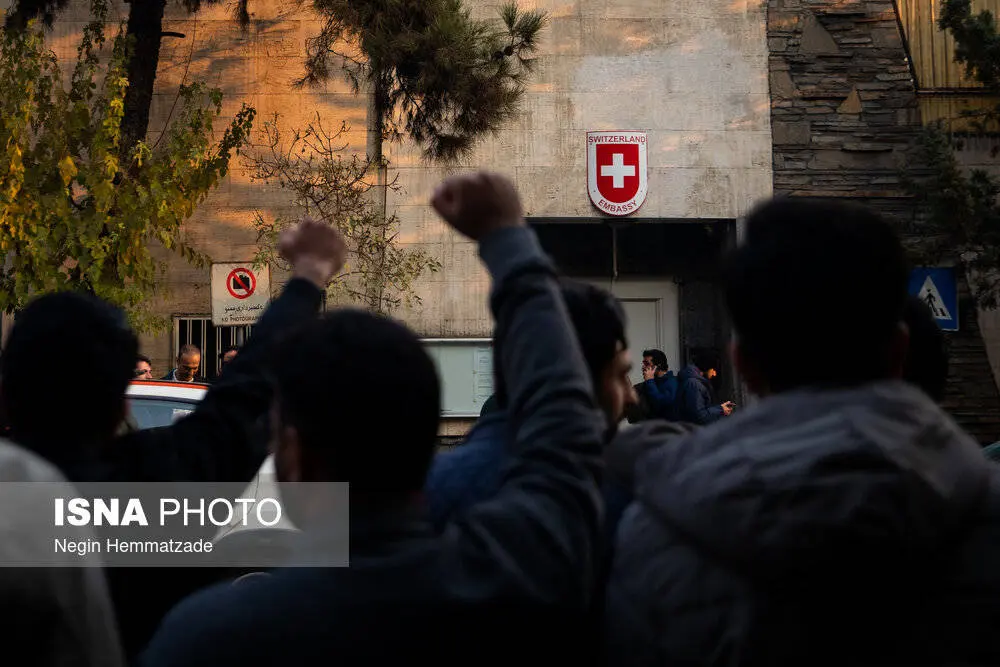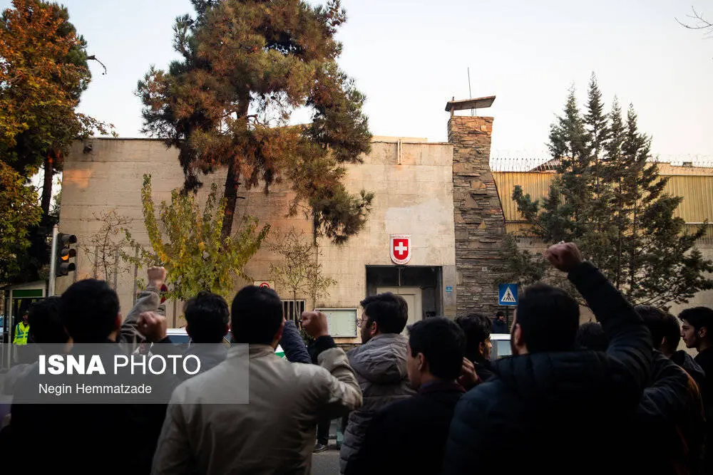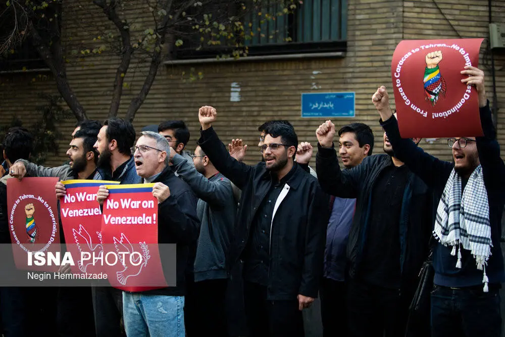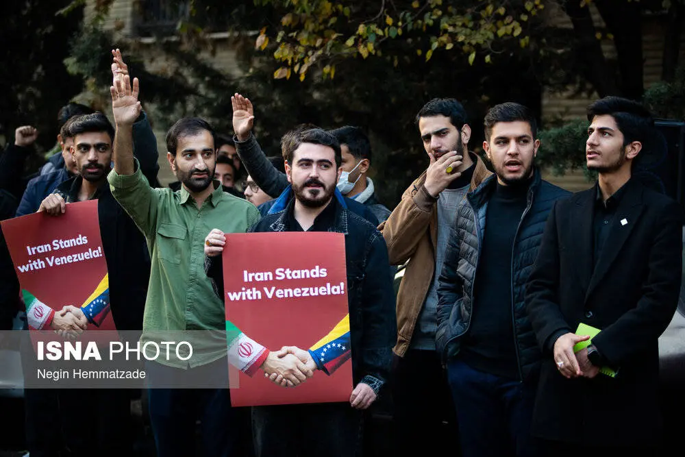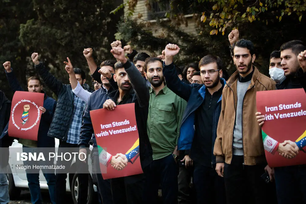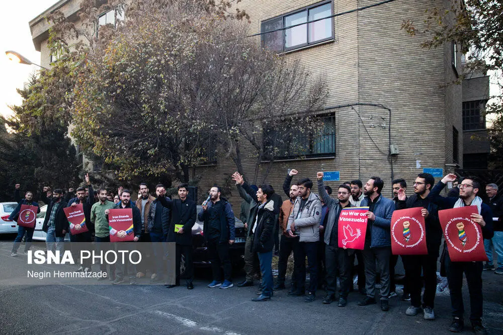 تجمع دانشجویی علیه آمریکا در محکومیت سیاستهای این کشور علیه ونزوئلا بعد از ظهر پنجشنبه ۲۹ آبان ماه ۱۴۰۴ در مقابل دفتر حافظ منافع آمریکا در تهران برگزار شد