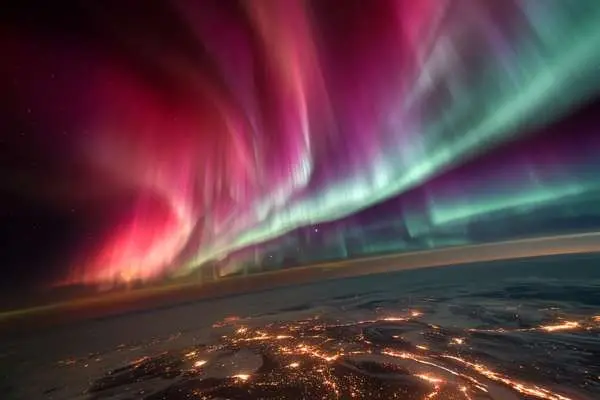 تصاویر خیرهکنندهای که از ایستگاه فضایی بینالمللی منتشر شده نمایش باشکوهی از شفق قطبی شمالی (اورورا بوریالیس) را نشان میدهد.