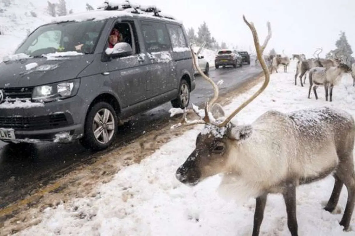 گوزنهای شمالی در ارتفاعات اسکاتلند در برف چرا میکنند، در حالی که خودروهایی که از میان رشتهکوه «کایرنگورمز» عبور میکنند، برای تماشای این حیوانات که بخشی از تنها گله آزاد بریتانیا هستند، توقف میکنند. بریتانیا اولین موج سرمای زمستان را تجربه میکند و بخشهایی از شمال انگلستان و اسکاتلند پوشیده از برف است.