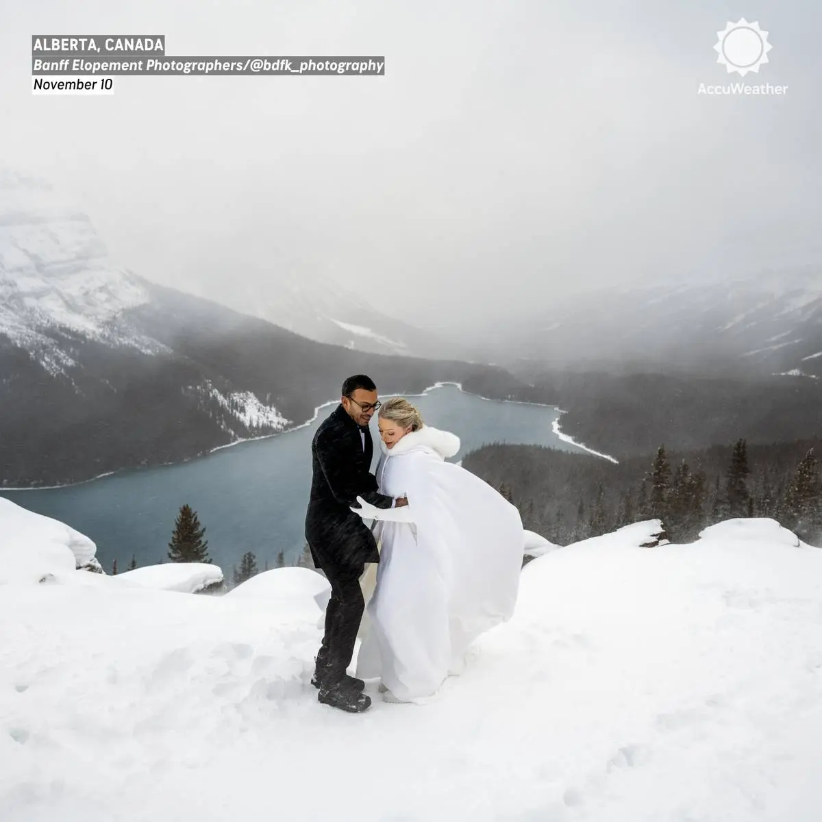 یک زوج با وجود برف و باد شدید، در دریاچه پیتو در پارک ملی بنف کانادا یک عروسی نفسگیر برگزار کردند.