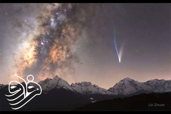 ناسا تصویری خیرهکننده از دنبالهدار لمون در کنار کهکشان راه شیری و کوههای هیمالیا ثبت کرده است. دنبالههای سفید و آبی دنبالهدار در مقابل میلیاردها ستاره، صحنهای تماشایی از کیهان را خلق میکنند.