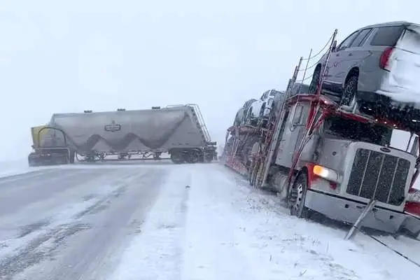 پس از اینکه طوفان زمستانی با بادهای شدید و بارش برف سنگین مینهسوتا را درنوردید، چندین کامیون در بزرگراه ۹۴ در غرب مینهسوتا دچار وضعیت جکنایف شده و گیر کردند.
