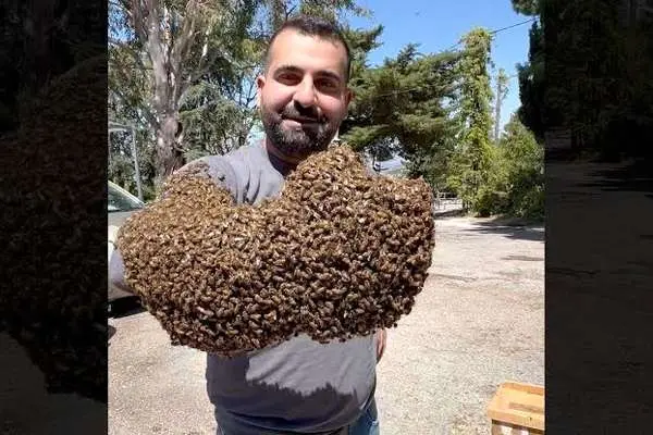 مردی که ۱۲ کیلو زنبور را در دست میگیرد