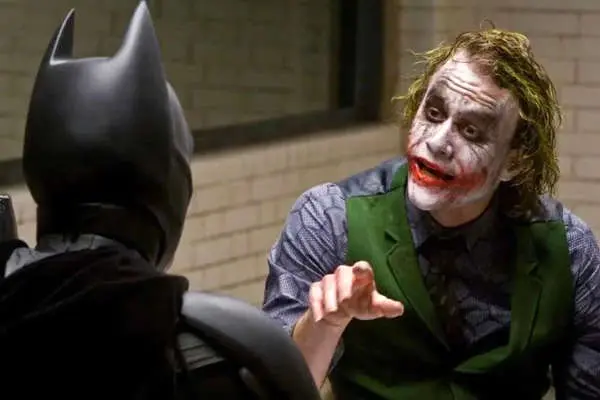 در تصویری جالب و خاطرهانگیز از پشت صحنه فیلم The Dark Knight (محصول سال ۲۰۰۸) هیث لجر، بازیگر نقش جوکر، در حال پریدن از روی کریستین بیل، بازیگر نقش بتمن، است.